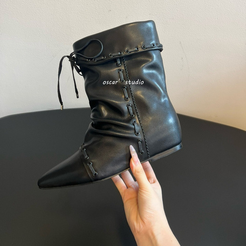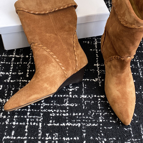 รองเท้าบูทสั้นหัวแหลมสำหรับผู้หญิง2025ใหม่รองเท้าหนังนิ่มแบบวินเทจหนังกลับแบบแบนครึ่งน่องแฟชั่นสวมแบบคาวบอยตะวันตกสำหรับฤดูหนาว